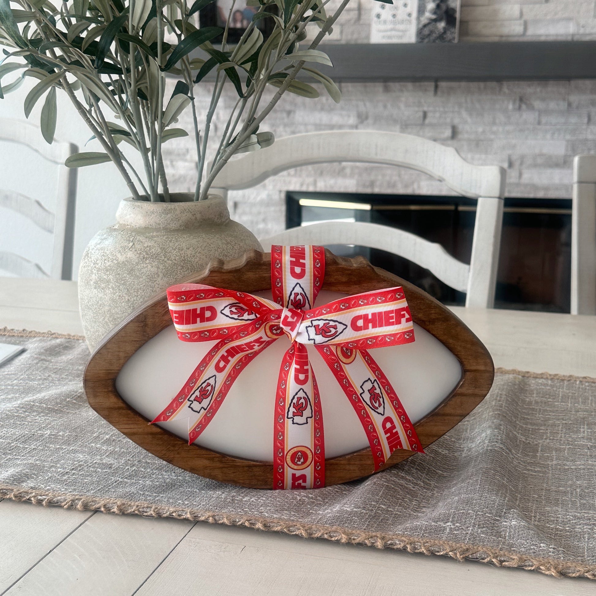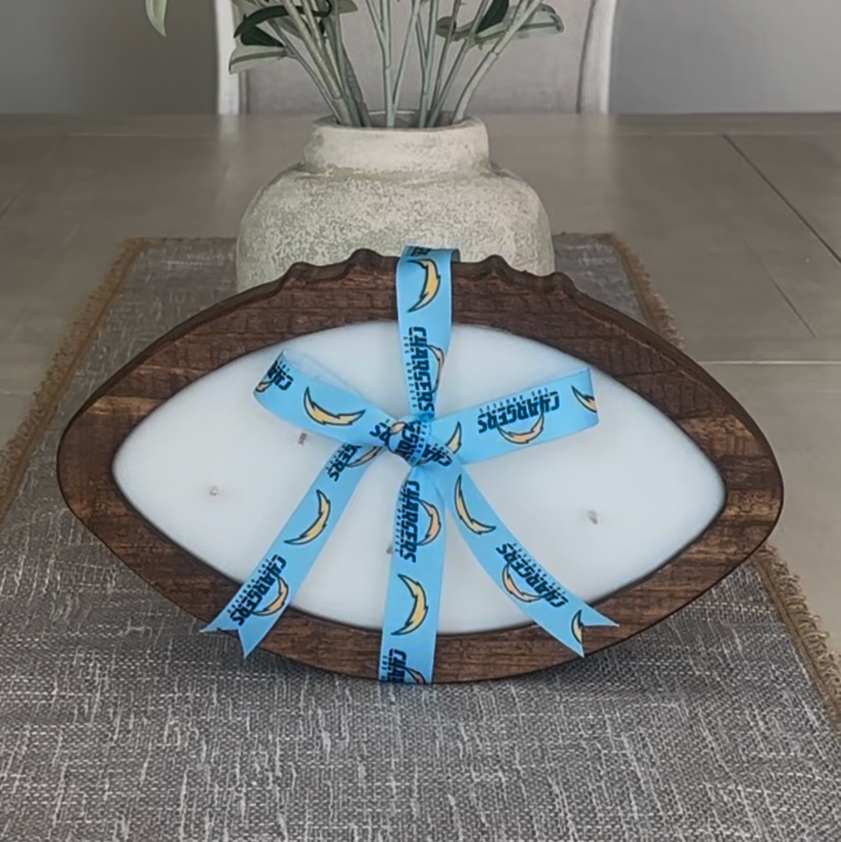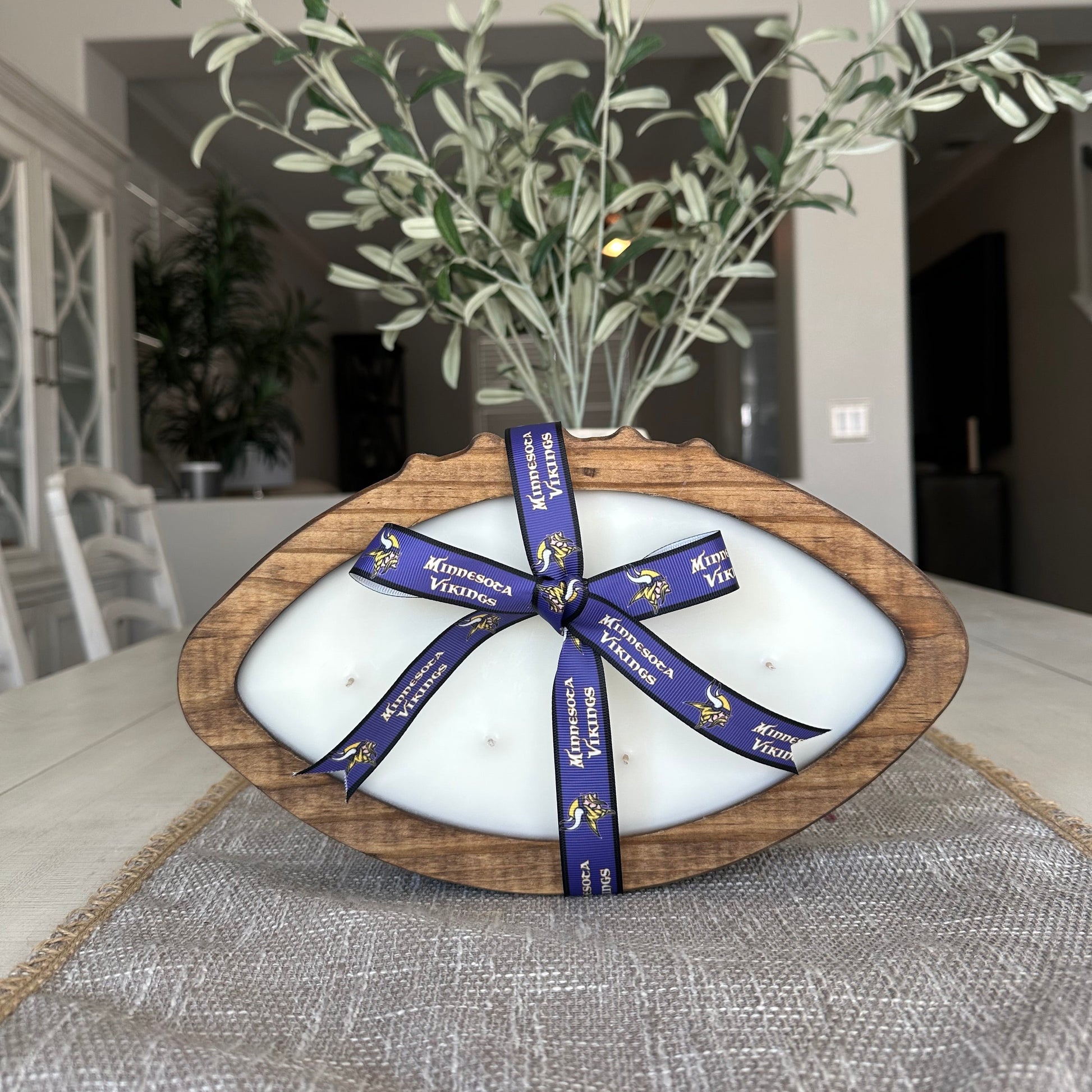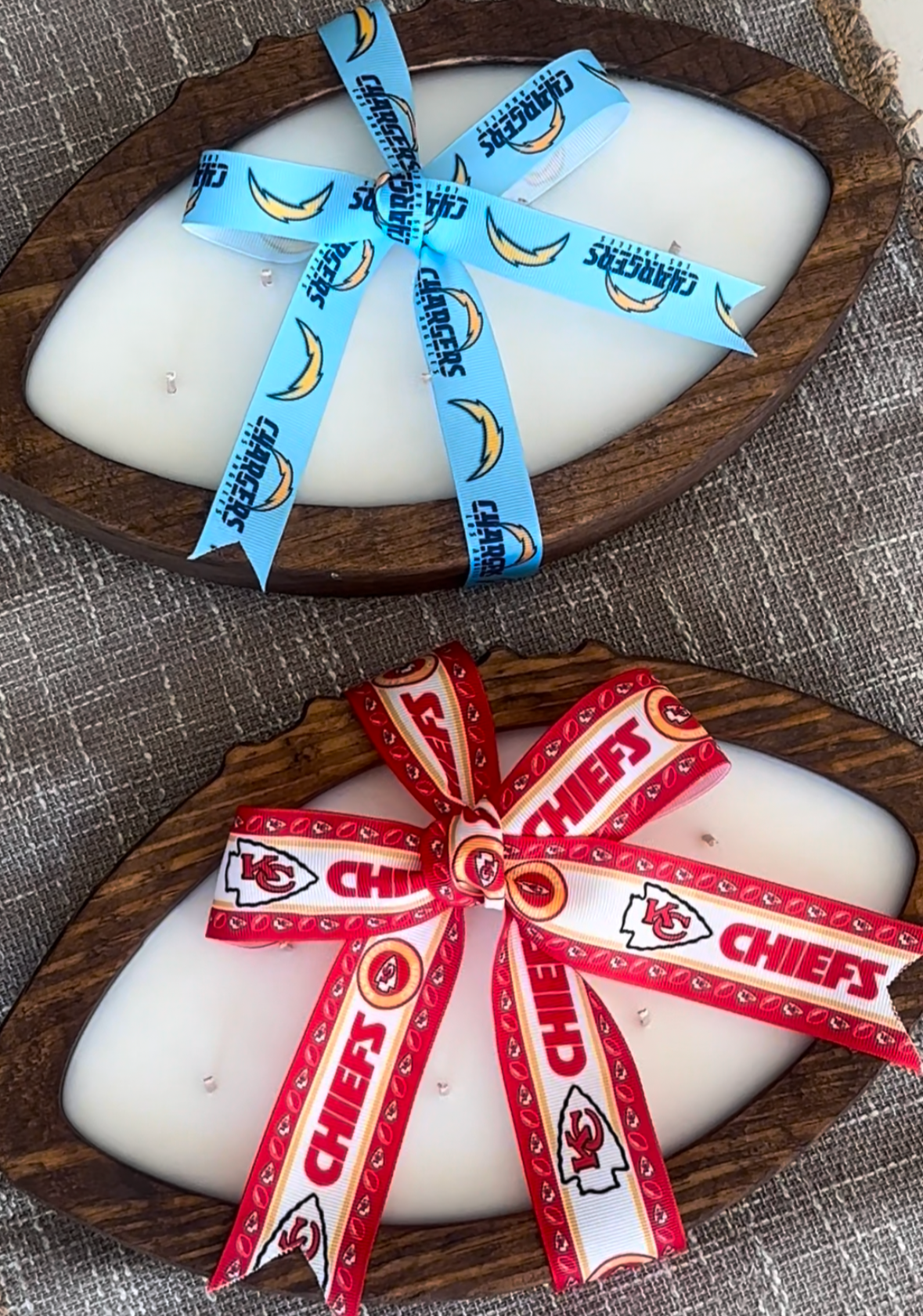 Bring the heat with our exclusive Big Wood candle, the MVP of our NFL collection. This 25 oz wooden football-shaped candle is perfect for die-hard fans and game day enthusiasts! Personalize your candle with your favorite team’s ribbon and unique scent. Ideal for gifts or adding a sporty touch to your home decor. Don't miss out- score yours today for the ultimate NFL fan experience!